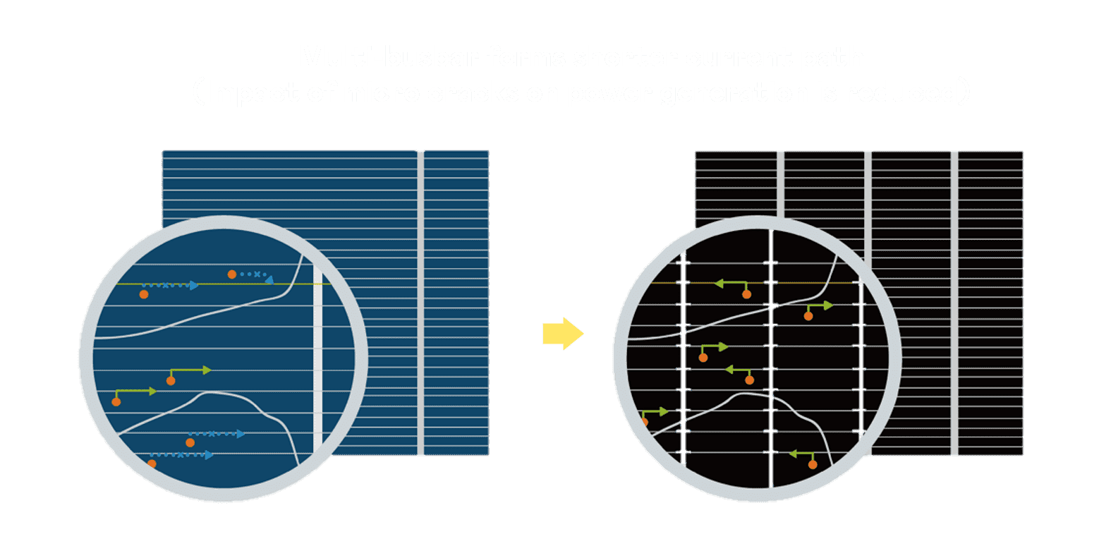 • 电池使用多条铜导线 (Copper wire) 于电池片上形成较短的电流路径,,提高电流收集效率,,,,采用圆形设计的铜导线较传统扁平式的铜焊带 (Ribbon),,,可增加入射至电池的光线量。。。
