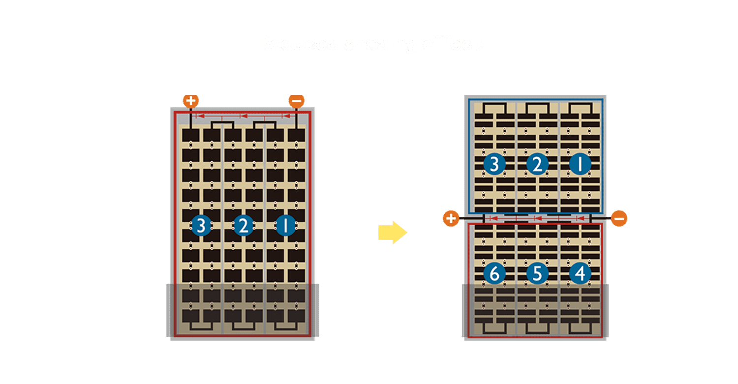 • 结合半切电池,,,,降低遮阴影响、、提升模组抗隐裂能力、、、、并减少电阻损耗,,进一步提升模组发电效能。。。